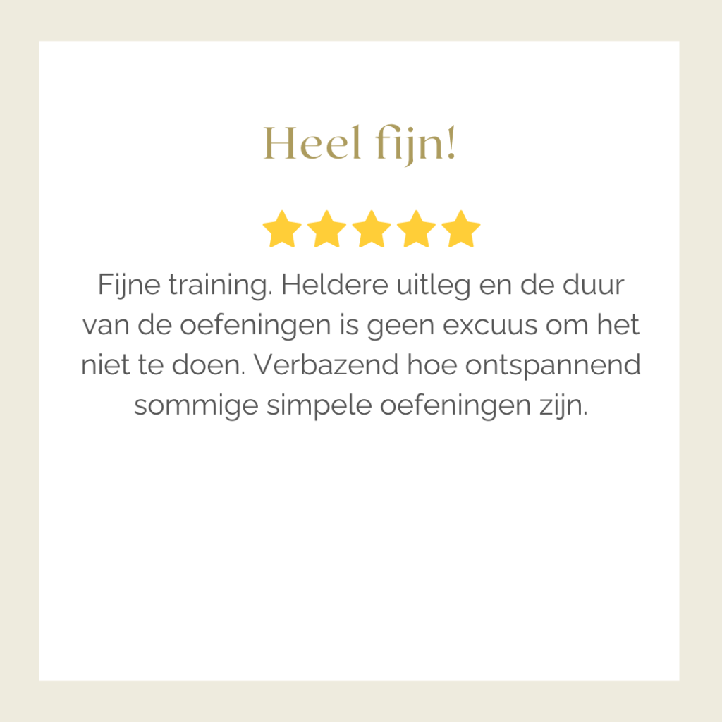 Aan het einde van deze training weet je precies welke oefening je wanneer in kunt zetten om weer te ontspannen, je gedachtes tot rust te brengen en je zenuwstelsel te kalmeren.
