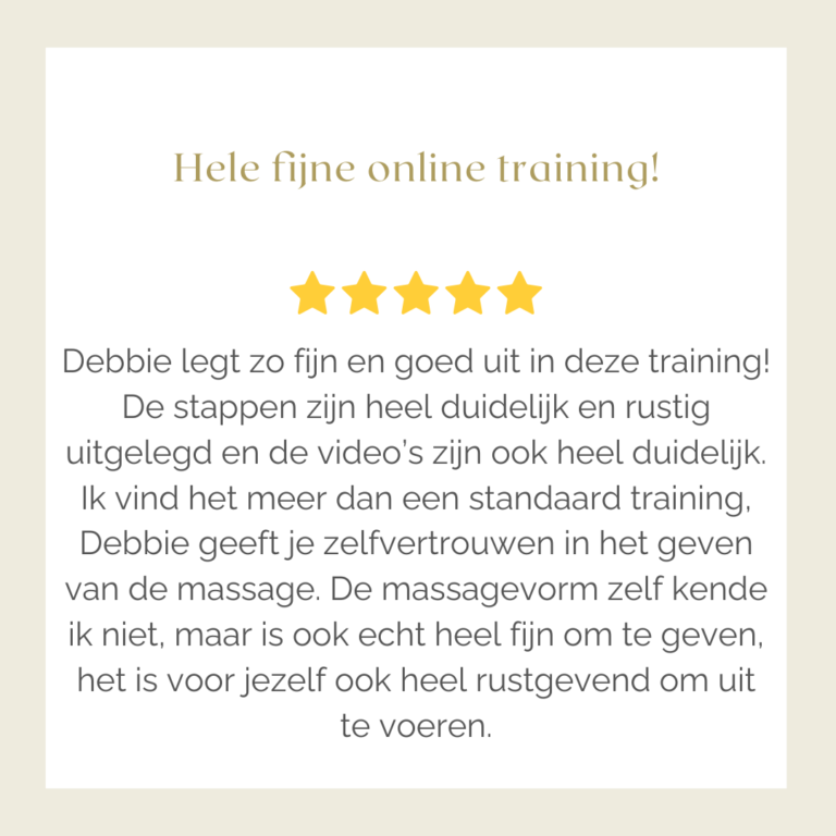 Je krijgt dan uitgebreid antwoord en waar nodig op maat gemaakte video’s, zodat je na het volgen van de training deze massage vol vertrouwen zelf kunt gaan geven.