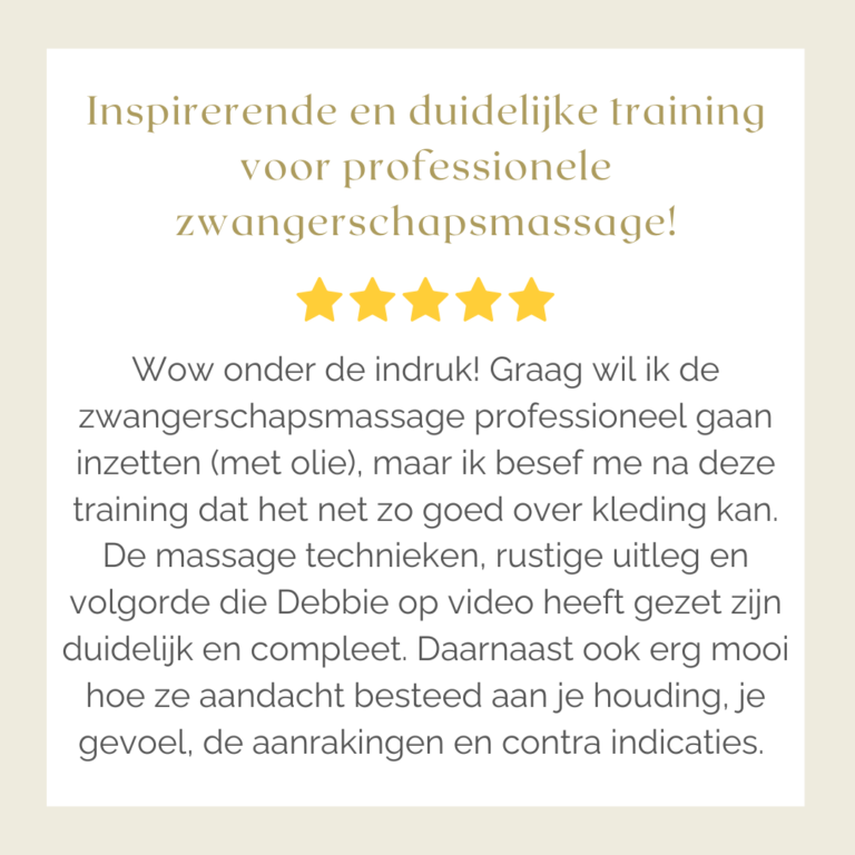 Ik vind dat iedere zwangere vrouw het verdient om gemasseerd te worden. Door een masseur, geboortewerker of door haar partner. Ervaring met masseren is daarom voor het volgen van deze training niet nodig. Heb je nog nooit iemand een massage gegeven? Maak je dan geen zorgen. Ik neem je stap voor stap mee zodat je straks vanuit rust en ontspanning een fantastische behandeling kunt geven.